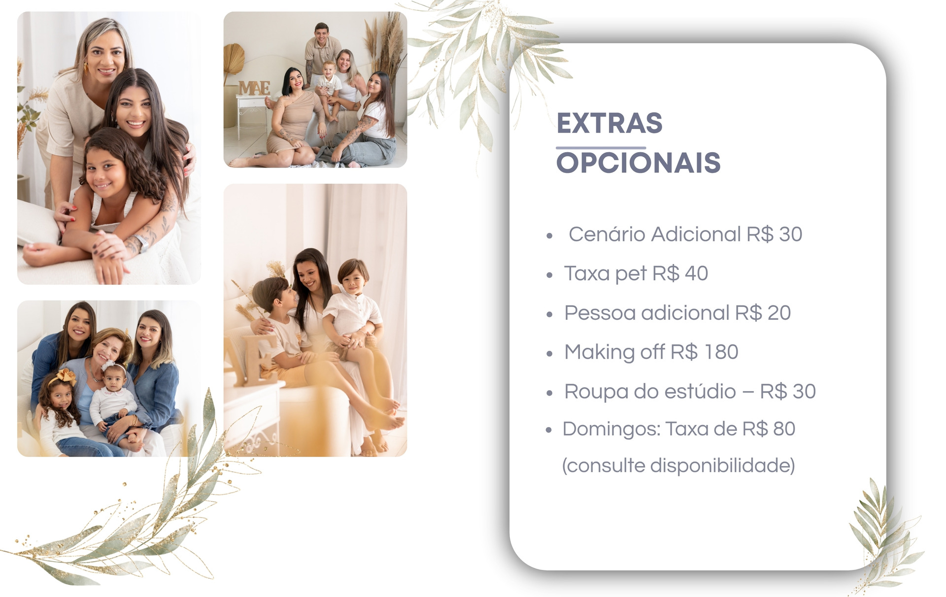 Para os adultos e famílias, pedimos que tragam suas próprias roupas, escolhendo peças sem estampas e dentro da mesma paleta de cores do cenário escolhido, para que as fotos fiquem mais harmônicas e elegantes. Nossa equipe pode ajudar com sugestões de combinações que valorizam o estilo de cada ensaio. 👗👕